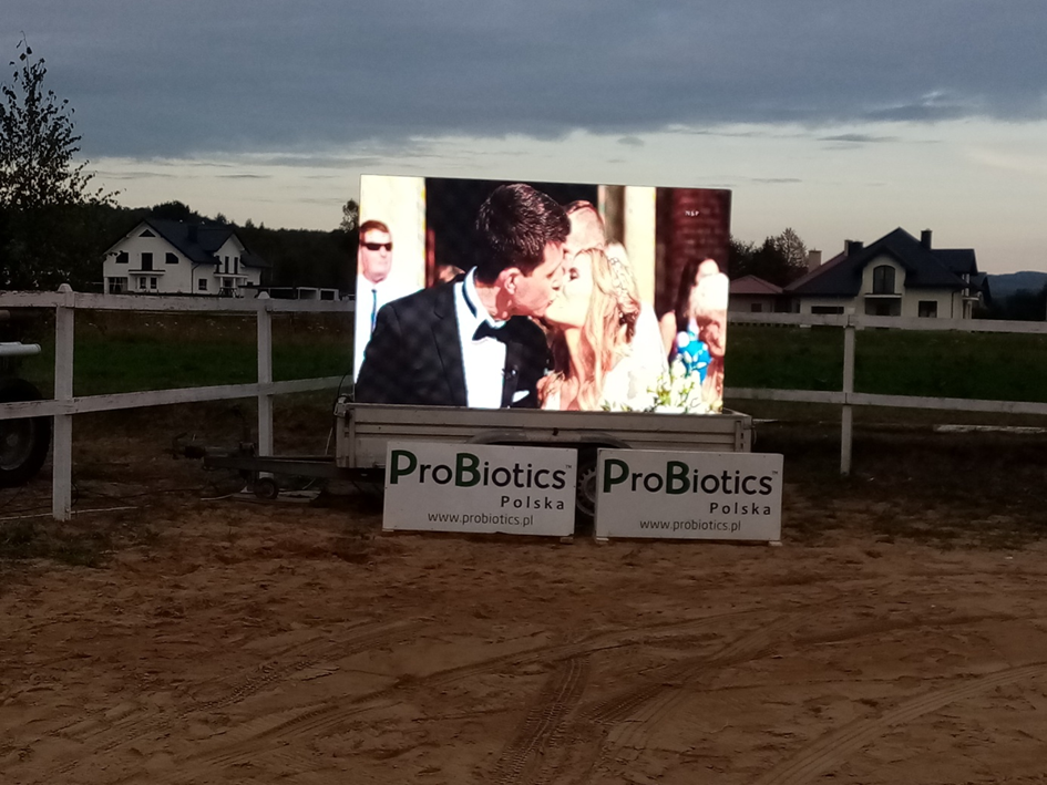Posiadamy profesjonalny sprzęt mobilny - telebim o wielkości 3m x 2m wraz z zestawem nagłośnienia. Nadaje się świetnie zarówno na szkolenia dla Twojej firmy jak również w celach reklamowych. Mamy możliwość emisji wydarzenia prosto z kamery na telebim.